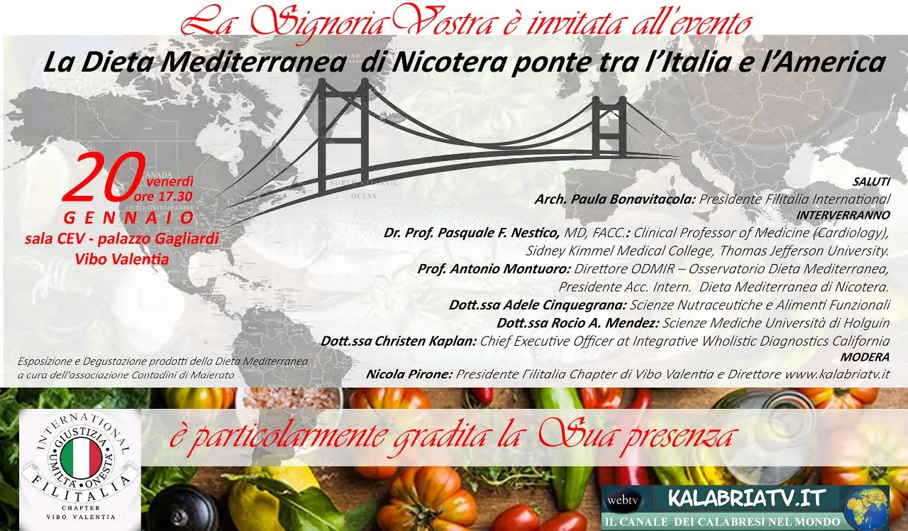 La Dieta mediterranea di Nicotera al centro di un convegno organizzato dalla Filitalia International di Vibo Valentia, che si terrà venerdì 20 gennaio alle ore 17:30 nella sala Cev di Palazzo Gagliardi. «A partecipare all’evento – è scritto in una nota di Filitalia – ci saranno luminari della medicina, ricercatori e medici, con lo scopo di promuovere ancora di più un patrimonio che la Calabria ancora non sfrutta a pieno. I lavori, che saranno condotti dal nostro direttore e presidente della Filitalia di Vibo Valentia, Nicola Pirone, saranno aperti dal saluto della presidente della Filitalia International, Casa Madre di Philadelphia, Paula Bonavitacola. Successivamente si passerà agli interventi con gli ospiti di caratura internazionale. Il primo sarà il professor Pasquale Francesco Nestico, (Md, Facc. clinical professor of Medicine (Cardiology), Sidney Kimmel Medical College, Thomas Jefferson University di Philadelphia) che si occuperà de “La dieta Mediterranea vista dagli occhi di un Cardiologo”». [Continua in basso]