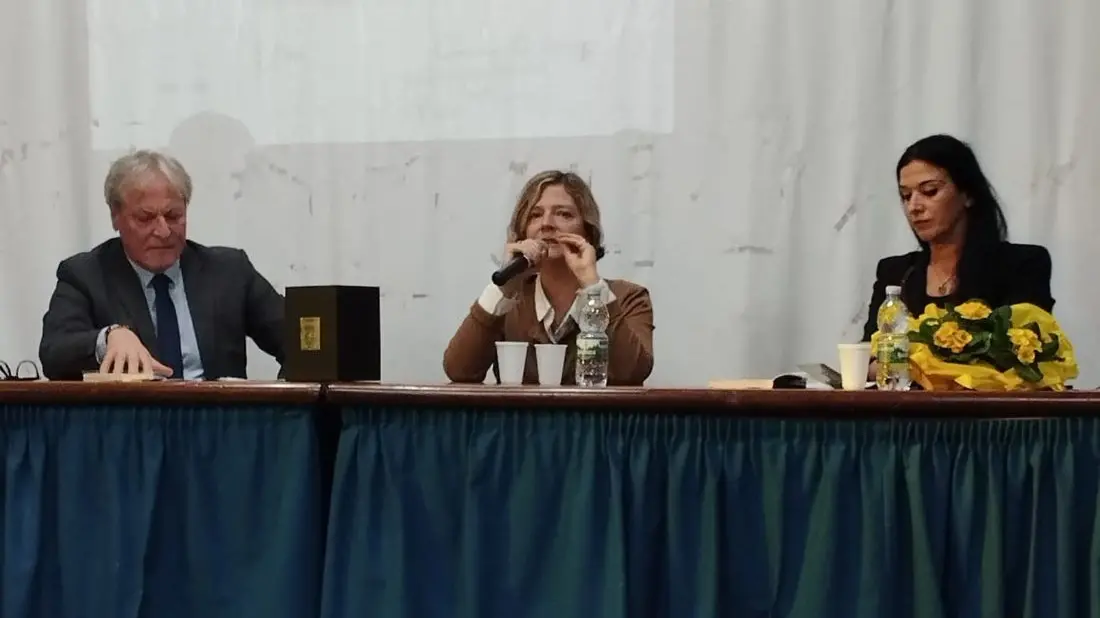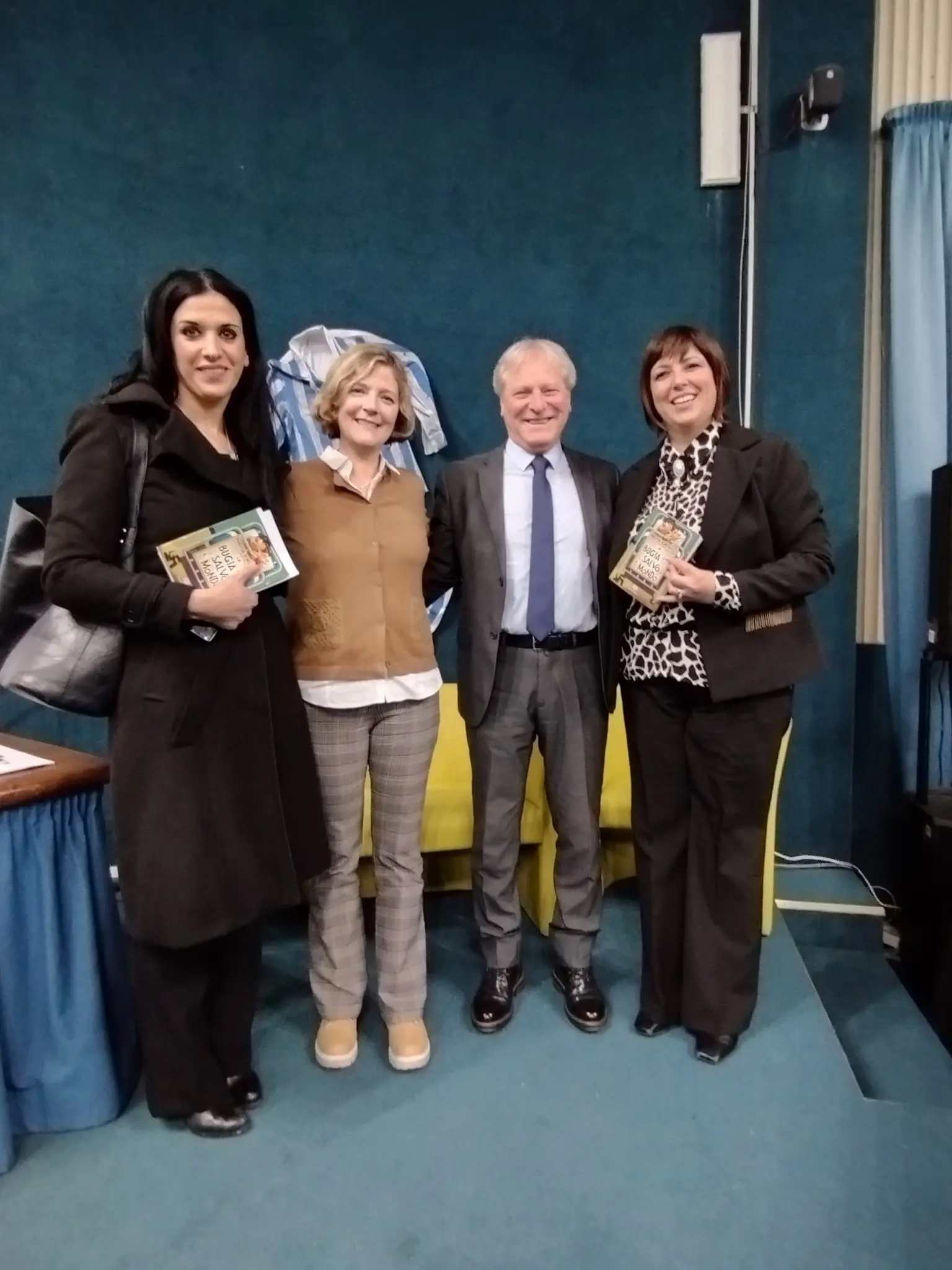 La professoressa Calafati, da parte sua, partendo da una citazione di Ugo Foscolo, tratta dal carme Dei Sepolcri – “…e l’armonia vince di mille secoli il silenzio” – ha rimarcato “quanto la poesia possa contribuire a vincere l’oblio, perché la letteratura e la narrativa sono gli strumenti dell’eternarsi dell’uomo; lo stesso Primo Levi, nel sentire l’urgenza di comunicare l’orrore vissuto da donne, bambini e uomini nei lager nazisti, ha pensato che solo attraverso la scrittura quell’orrore avrebbe potuto acquisire valenza di monito per tutti gli uomini. Da chimico, Levi diventa alchimista delle parole, per narrare l’indicibile ed esecrabile che si era compiuto sotto gli occhi di tutti, tra l’indifferenza e la connivenza di chi ha preferito girarsi dall’altro lato, di chi ha guardato alla tutela del proprio orticello, di chi ha pensato bene di rispettare una legge che riguardava l’altro, il diverso, l’hostis della lingua latina, ovvero il nemico. Passando al libro – ha proseguito Calafati – esso è caratterizzato da un impianto accattivante, la storia procede in ordine cronologico e le sequenze narrative coesistono con quelle descrittive, in cui il fiume Tevere la fa da padrone”. Dall’interlocuzione con l’autrice del libro, ne è nata poi una bella e intensa conversazione – molto apprezzata dal pubblico presente – fatta di domande e risposte, di considerazioni e riflessioni, di approfondimenti, che hanno messo in evidenza tutta la bravura e sensibilità dell’autrice stessa, le sue capacità narrative e descrittive, la sua predisposizione al dialogo, l’interesse con cui si è avvicinata ai temi della Shoah. Così, pian piano, attraverso le calzanti e pertinenti sollecitazioni dei due interlocutori e la sapiente e coinvolgente narrazione dell’autrice, si sono conosciuti i tratti salienti del romanzo, si è meglio dipanata la sua struttura narrativa, si sono meglio conosciuti i suoi personaggi, sono stati precisati i riferimenti storici e i loro contorni, sono stati definiti gli elementi di finzione e puramente narrativi. Il pubblico ha così potuto apprezzare la storia di una grande e straordinaria amicizia – quella tra i due adolescenti Amos e Cloe –, sincera e innocente, che va oltre ogni barriera culturale e sociale, il cui normale scorrere viene spezzato prima dalle leggi razziali e antisemite e successivamente dallo scoppio della guerra: una storia che fa riconoscere il valore ed il senso della vera amicizia, dunque. E poi, la figura straordinaria ed eroica di Giovanni Borromeo, Giusto tra le Nazioni, medico romano, che grazie alla sua colossale bugia – l’invenzione di una malattia inesistente e contagiosa, il Morbo di K –, mettendo a rischio la sua vita e quella dei suoi familiari, riuscì a salvare molti ebrei, ricoverandoli, durante i rastrellamenti, nell’ospedale Fatebenefratelli, sull’isola Tiberina, dove era primario. E poi lei, la bugia, quella bugia che in certi momenti ed in certi contesti serve a salvare vite umane. Perché “non tutte le bugie sono cattive”; perché “ci sono bugie che salvano e verità che uccidono”; perché “la Storia, con i suoi inganni, i falsi miti o le verità negate, appare talvolta come una terribile e meravigliosa bugia”: tutte affermazioni che riflettono sulle dualità della bugia e della verità nei diversi contesti e nelle diverse sfere della vita; affermazioni che ci suggeriscono come il bilanciamento tra verità e bugie sia un processo delicato, che dipende dal contesto e dal fine; affermazioni che sottolineano la necessità di discernimento nell’affrontare situazioni complesse, dove la scelta tra verità e bugia può avere conseguenze profonde, come si evince dal romanzo La bugia che salvò il Mondo.