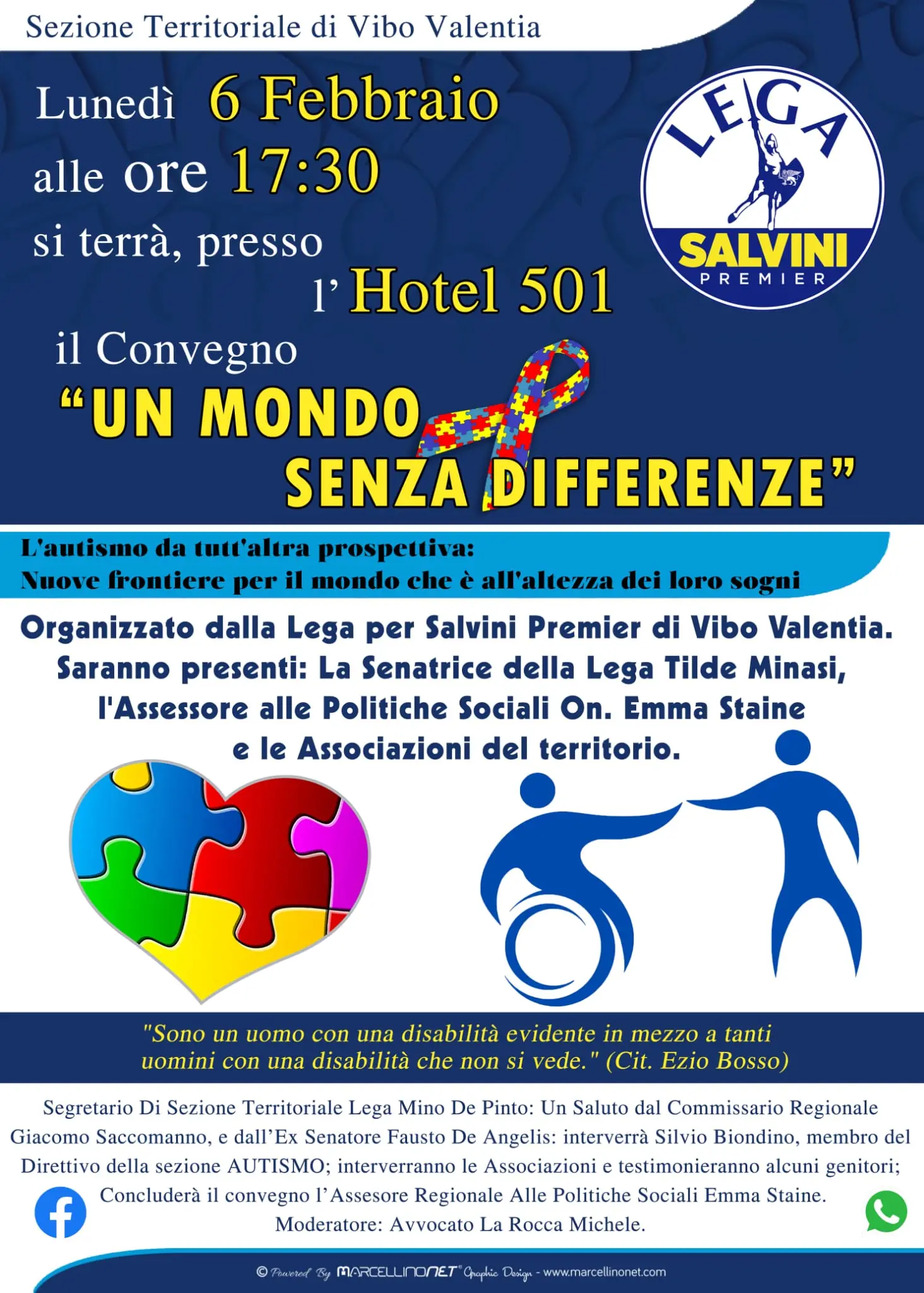 Nella giornata del 6 febbraio, alle ore 17:30, all’interno del 501 hotel di Vibo Valentia si svolgerà il primo evento del nuovo corso politico della Lega di Vibo Valentia “Un mondo senza differenze”, un incontro che verterà su una tematica importante e molto attuale legata ai disturbi dello spettro autistico, “spesso messa in secondo piano da una società non sempre attenta ai bisogni dei più svantaggiati – afferma Mino De Pinto in una nota stampa – Alla manifestazione, saranno presenti la senatrice Tilde Minasi e l’assessore regionale alle politiche sociali e trasporti Emma Staine, oltre a Giacomo Saccomanno, Fausto De Angelis, Silvio Biondino e Michele La Rocca il quale, modererà l’incontro”. La finalità del convegno “sarà quella di dare pieno supporto alle persone con disabilità e alle loro famiglie – prosegue – in un territorio da sempre avaro di opportunità per chi vive situazioni di disabilità sia sul piano fisico sia psichico. Il partito della Lega di Vibo appare decisamente “mutato” rispetto agli scorsi anni e, negli ultimi mesi, sta iniziando a creare diverse iniziative nel panorama politico locale anche grazie al cambiamento di tante figure apicali in seno al proprio organigramma partitico”, ha dichiarato il segretario De Pinto. [Continua in basso]