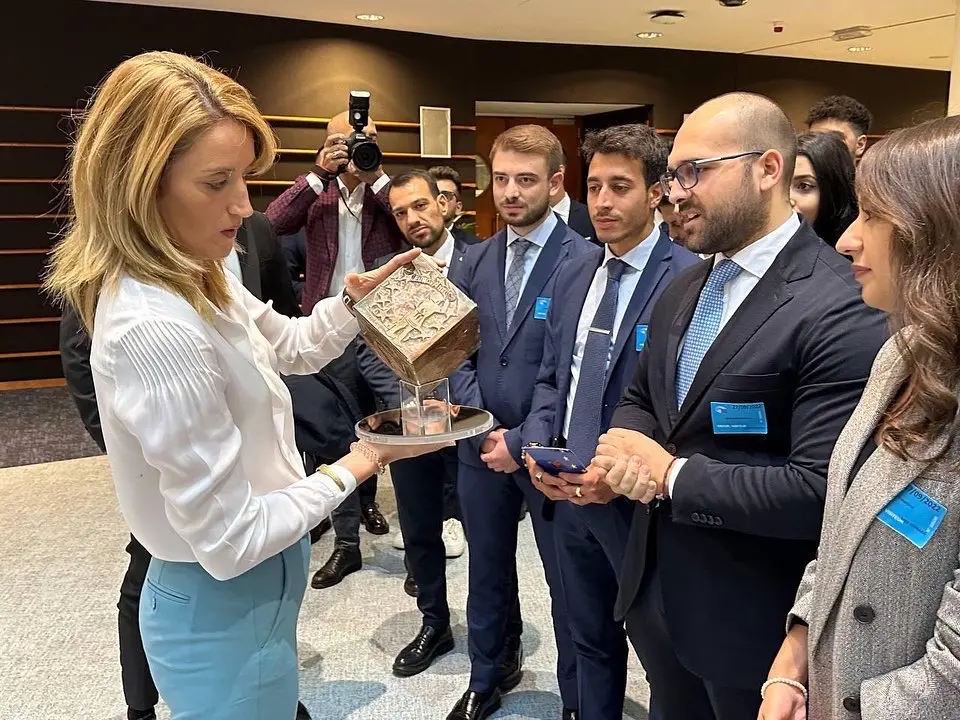 Una delegazione dei membri dell’associazione Valentia è stata ospite del Parlamento Europeo a Bruxelles, dove ha incontrato la presidente del Parlamento Europeo, Roberta Metsola. L’associazione ha donato un’opera d’arte, realizzata dal maestro Antonio La Gamba, che sarà esposta all’interno del Parlamento. Si tratta di un cubo in rame su cui sono rappresentate sei raffigurazioni diverse: l’olivo, uno dei simboli della regione Calabria, e icona di pace, fratellanza, unione e amore tra tutti i popoli del mondo; una bambina, simbolo dell’anno Europeo dei giovani; il sole, segno di energia e di vita che ricorda l’impegno per uno sviluppo ecologico e compatibile; l’emiciclo del Parlamento, che simboleggia il cuore pulsante della democrazia Europea; San Benedetto da Norcia, protettore dell’Europa, e Persefone, moglie di Ade, protagonista dell’omonimo mito. [Continua in basso]