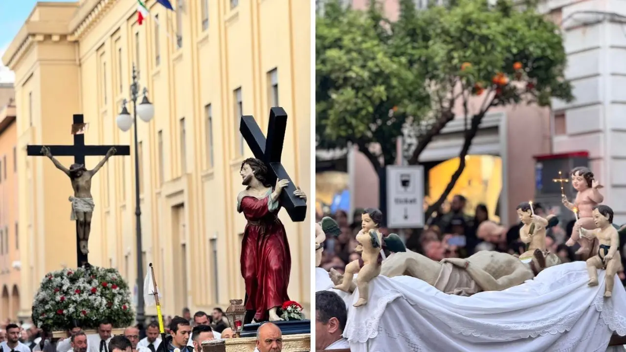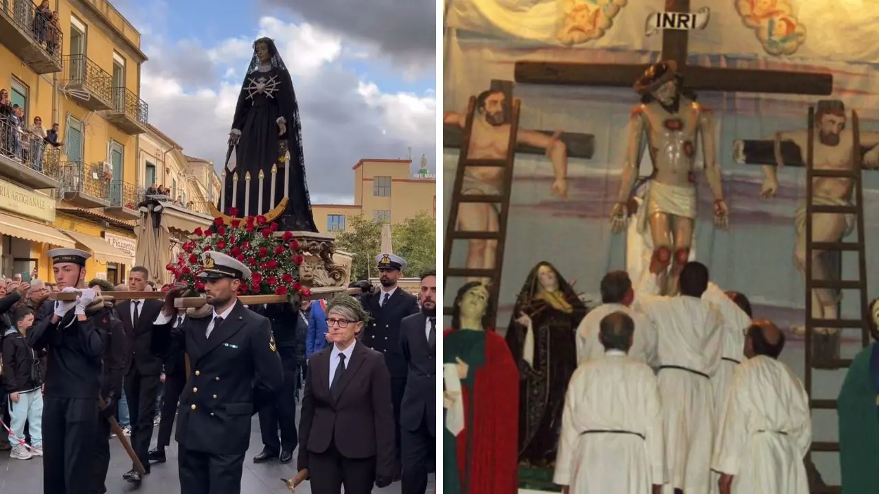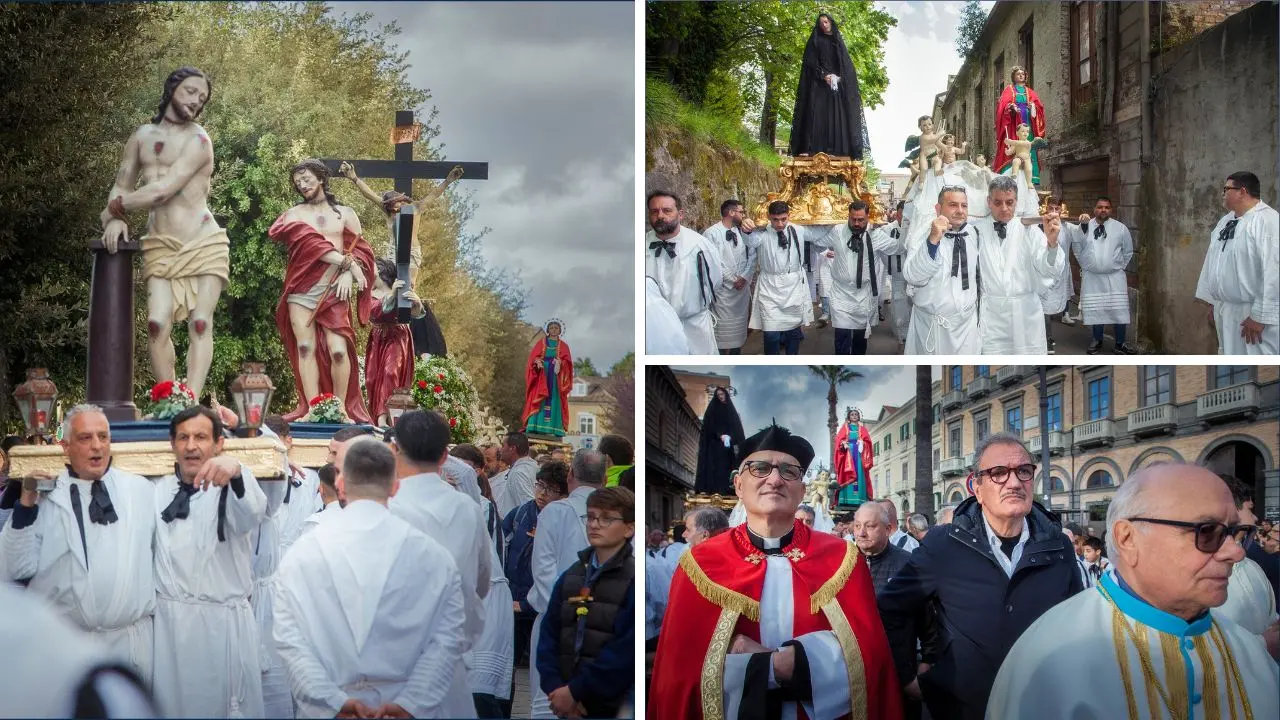 La Settimana Santa si avvia al suo clou, la Domenica di Pasqua. Ieri, Venerdì santo, giorno della morte di Cristo, Vibo Valentia ha vissuto uno dei momenti più importanti in vista dell’Affruntata: la processione delle ”Vare”. Per le vie della città hanno sfilato i simulacri che ripercorrono i passaggi più mesti della Passione, dall’orto degli ulivi, alla crocifissione, accompagnandosi ad un andamento solenne scandito dalle marce funebri eseguite della banda e precedute dalla cosiddetta ”tocca”, strumento che scandisce colpi secchi e cupi, chiudendo il venerdì, nella tarda serata con la processione dell’Addolorata.