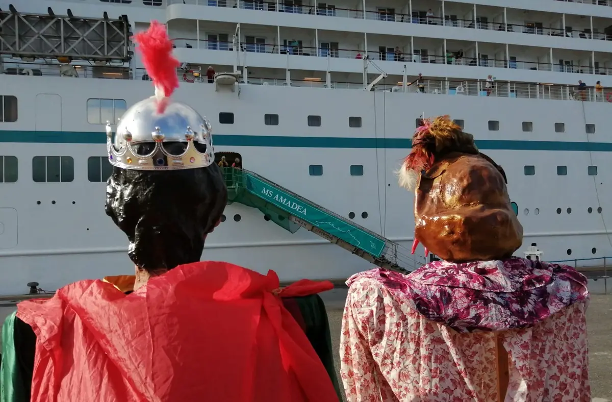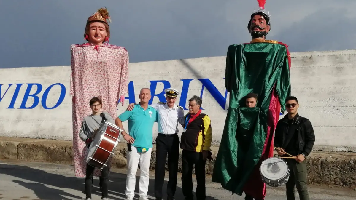 Mata e Grifone, i due giganti di cartapesta, rappresentano la riconquistata libertà dopo secoli di dominazione saracena. Forse i turisti tedeschi non sapevano l’origine storica di questa danza liberatoria, ma il suono frenetico dei tamburi e le giravolte festose dei due personaggi hanno attirato la loro attenzione più di ogni altra forma di accoglienza, spesso rituale, incontrata in altri porti. Ecco che allora si sono affacciati dai ponti della nave salutando, applaudendo e ritmando le mani per accompagnare il ballo dei due giganti. Anche il comandante della nave ha voluto assistere all’inconsueto spettacolo, offerto dalla Pro loco, ed è sceso in banchina facendosi fotografare accanto ai due giganti di cartapesta ed ai ragazzi che li rendono animati, in un momento di autentica socialità. Una cinquantina di crocieristi è poi salita sull’autobus che li ha portati in visita nella città capoluogo, mentre molti altri hanno preferito visitare la cittadina portuale che, benché non possa offrire al momento, a causa di atavici ritardi, punti di richiamo di particolare interesse culturale, rappresenta pur sempre un esempio di tipico paese-porto mediterraneo. Piccoli gruppi di turisti hanno invaso il lungomare, godendo del sole che a sprazzi faceva capolino dalle nuvole, alla scoperta di angoli, vicoli, negozi e bar aperti dove hanno voluto gustare i gelati di produzione artigianale. [Continua in basso]