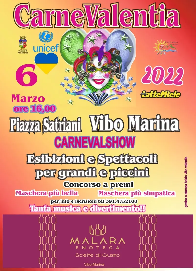 È in programma per domenica 6 marzo a Vibo Marina la seconda edizione di Carnevalentia. Una festa di carnevale con mascherine, sfilate e artisti di strada che quest’anno si svolgerà in un’atmosfera particolare, intrisa di preoccupazione per quanto sta accadendo in Ucraina. È per questo motivo che – informa l’organizzatore, l’Ente Promozione Calabria – tutti i contributi che deriveranno dalle varie sponsorizzazioni all’evento saranno devoluti all’Unicef sezione provinciale di Vibo Valentia, proprio in sostegno dei bambini ucraini. [Continua in basso]