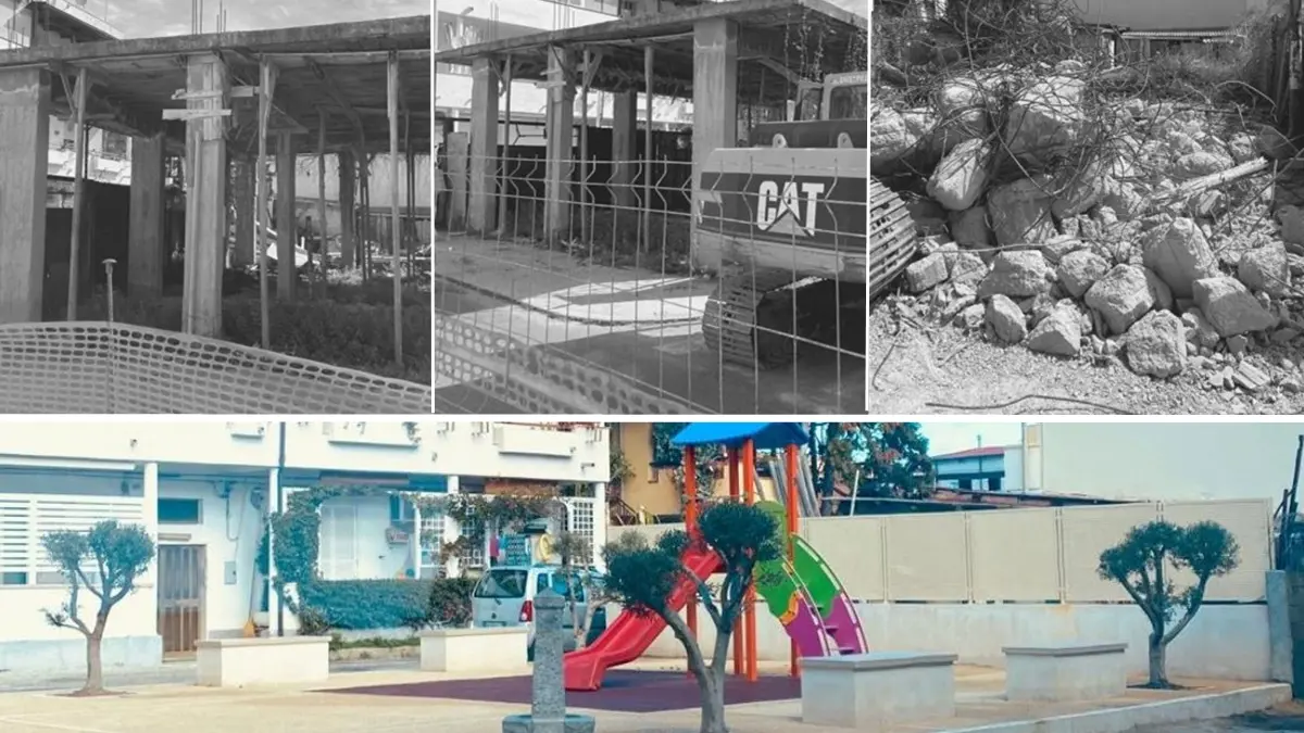 Dopo la demolizione del manufatto abusivo che occupava l’area, è stata installata una pavimentazione antitrauma e, oltre alle attrezzature ludiche, è stata posizionata anche una fontana in pietra e piantumati quattro ulivi.