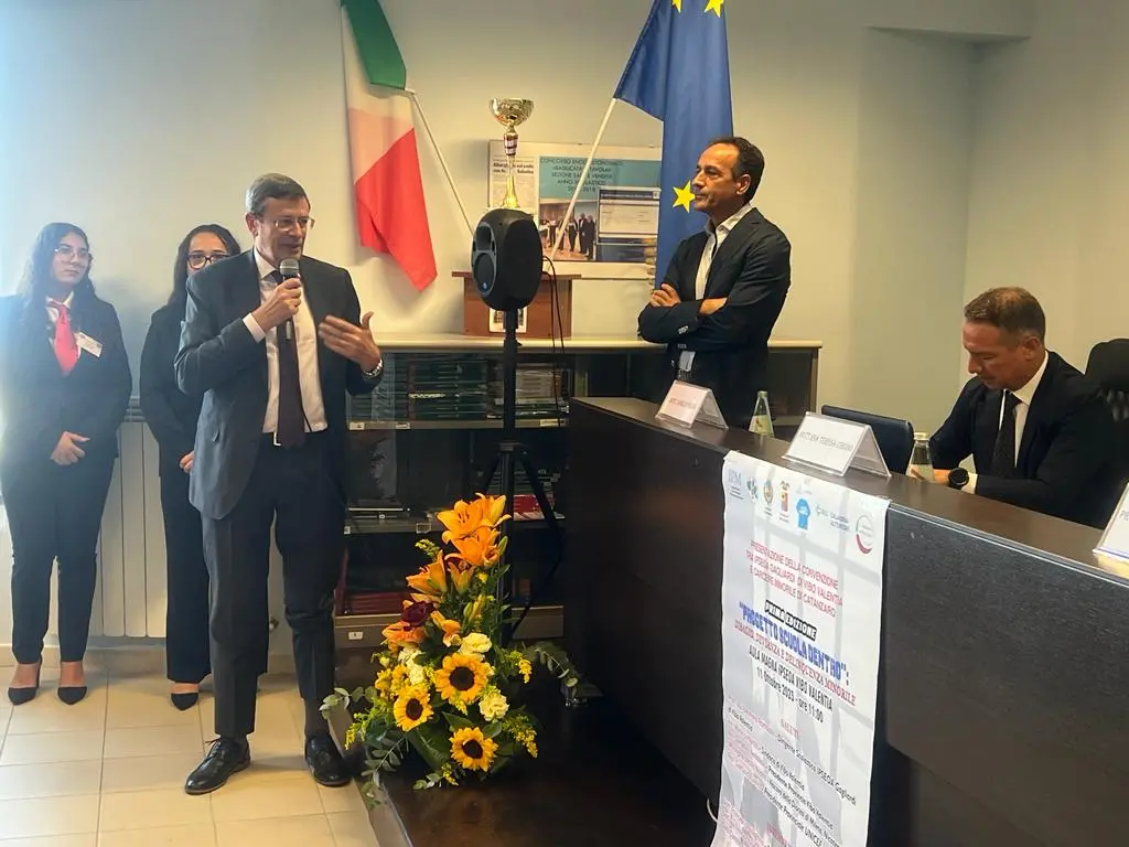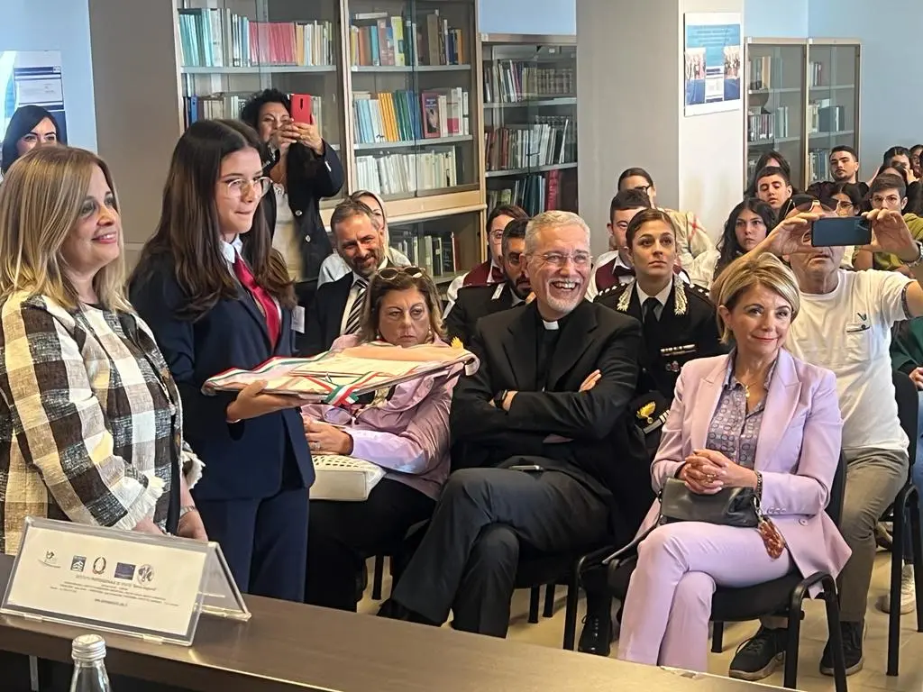 Nell’aula Magna dell’Ipseoa “E. Gagliardi” si è svolta la manifestazione di inaugurazione del progetto “Scuola dentro” con lo scambio simbolico della convenzione stipulata tra la scuola e l’Istituto penale per i Minori “Paternostro” di Catanzaro. Protagoniste dell’atto rituale la dirigente scolastica Eleonora Rombolà e la presidente del Tribunale dei Minori di Catanzaro Teresa Chiodo. L’obiettivo principale del progetto è dare delle risposte concrete al preoccupante fenomeno del disagio, della devianza e della delinquenza minorile. Testimoni e protagonisti diverse autorità istituzionali, del mondo scolastico e associativo, alla presenza degli studenti del “Gagliardi” ma anche di altri istituti della secondaria di primo grado. Sono intervenuti il prefetto di Vibo Valentia Paolo Giovanni Grieco, il procuratore della Repubblica Camillo Falvo, il vescovo della Diocesi di Mileto-Nicotera-Tropea monsignor Attilio Nostro, il vicedirettore dell’Ipm Gennarino Del Re, il sindaco di Vibo Valentia Maria Limardo, il presidente Unicef Vibo Valentia, Gaetano Aurelio e i diversi dirigenti scolastici, insegnanti e alunni della secondaria di primo grado che hanno aderito all’invito, con la partecipazione della referente regionale e provinciale Consulta degli studenti Franca Falduto, insieme ai vertici provinciali delle forze dell’ordine, i colonnelli Massimo Ghibaudo (Guardia di Finanza) e Luca Toti (Carabinieri). Inoltre era presente anche il presidente della Bcc Calabria Ulteriore Sebastiano Barbanti (l’istituto bancario insieme all’Artigiano della ‘nduja Luigi Caccamo, sponsorizzano il progetto). L’incontro è stato moderato da Nicola Rombolà, referente della comunicazione del Gagliardi. «Il progetto “Scuola dentro” ha colto nel segno dei tempi: tutte le autorità hanno elogiato il “Gagliardi” per l’iniziativa e per come saranno articolate le attività. È stata un’occasione per incontrarsi e incontrare gli studenti con la consapevolezza che sia necessario mettere insieme le varie istituzioni del territorio per la costruzione di valori capaci di dare risposte alle inquietudini che minacciano il presente e il futuro dei giovani». Lo ha ribadito la dirigente scolastica Eleonora Rombolà nel suo intervento introduttivo indicando nella “responsabilità della scuola” la chiave per creare compartecipazione con le altre istituzioni del territorio, per dare delle risposte efficaci e tempestive. Si è rivolta in particolare agli studenti «che oggi vivono con noi questo momento di accoglienza e di gioia, di prospettiva di fiducia in un futuro da costruire». Ha sottolineato che le nuove generazioni stanno vivendo non solo di un «disagio giovanile ma esistenziale, che coinvolge tutti, la popolazione adulta che è estremamente disorientata e che quindi ha necessità di avere delle risposte. In questa visione – ha aggiunto – la scuola si assume delle responsabilità individuali e collettive. Noi – ha osservato ancora la dirigente del “Gagliardi”– riteniamo indispensabile assumerci le nostre responsabilità». Per queste ragioni ha ringraziato tutti i vari rappresentati e autorità presenti, a partire dai dirigenti del primo e secondo ciclo di Vibo (Tiziana Furlano, Raffaele Vitale, Giuseppe Sangeniti, Luisa Vitale, Angelo Stumpo e gli alunni dei vari plessi: San Gregorio, Piscopio, Sant’Onofrio Monterosso Calabro, San Costantino, Pizzoni, Vazzano, Convitto Filangeri, Vibo Marina) che rappresentano «un fronte comune per individuare delle soluzioni» ad un fenomeno che più di «disagio, devianza e delinquenza minorile» si tratta di «vuoto esistenziale, in quanto viviamo in una fase in cui ogni certezza è venuta meno». E in questa assenza di riferimenti «si insinuano il senso di rabbia, di frustrazione, l’incapacità di gestire delle emozioni che spesso sconfinano nella trasgressività e diventano devianza e delinquenza anche nell’inconsapevolezza, quando si ha a che fare con giovani e adolescenti che non comprendono la portata del loro agire e le conseguenze».