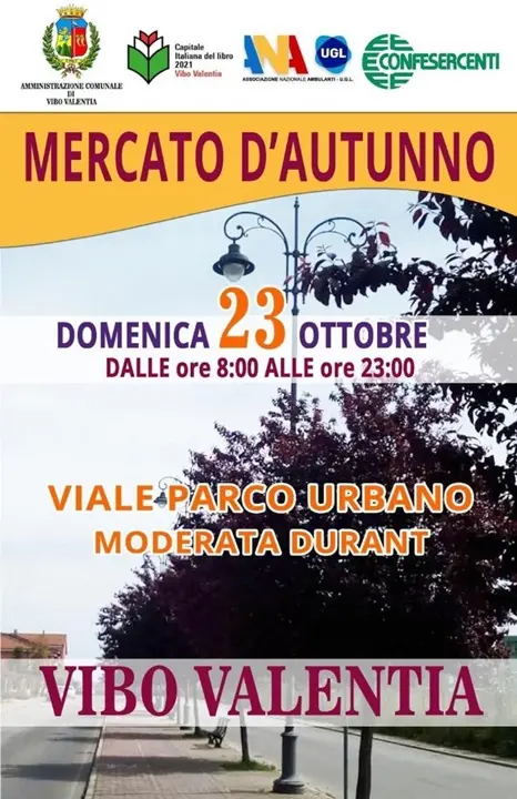 Promuovere l’aggregazione dei cittadini ed attrarre visitatori, dando impulso al commercio locale e ravvivando una domenica d’ottobre. Sono questi gli obiettivi del “Mercatino autunnale”, promosso dal Comune di Vibo Valentia con l’assessorato alle Attività produttive ed organizzato dalle associazioni di categoria Ana Ugl Calabria e Confesercenti Vibo Valentia. L’evento si terrà domenica 23 ottobre dalle ore 8 alle 23 in località Moderata Durant, sviluppandosi lungo tutto il viale che conduce al parco urbano che per l’occasione si riempirà di stand per acquisti di ogni tipo, dagli immancabili prodotti tipici all’abbigliamento, casalinghi, oggettistica. Sono decine gli esercenti che hanno aderito alla proposta, per un totale di circa 50 gazebo. [Continua in basso]