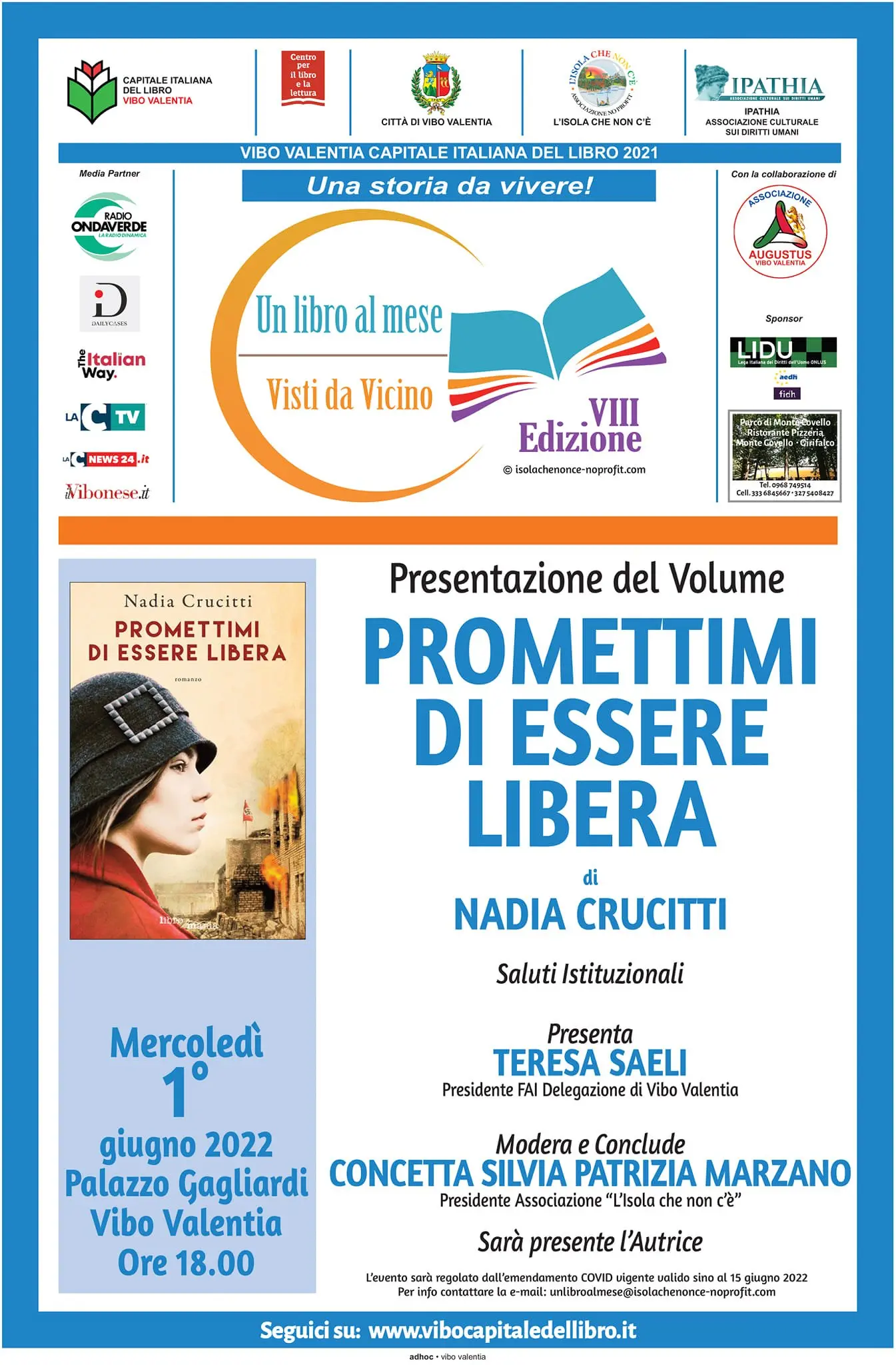 Ultimi tre appuntamenti per “Un libro al mese. Visti da vicino”, la rassegna letteraria organizzata e gestita dall’associazione “L’isola che non c’è”, che ha accompagnato Vibo Valentia Capitale del Libro 2021 sin dal suo inizio e che ora organizza gli ultimi tre eventi per la Città. L’1 giugno sarà ospite della rassegna la scrittrice Nadia Crucitti. Autrice di diversi romanzi, e tra questi “Casa Valpatri” (di cui Carlo Sgorlon scrisse “Romanzo aperto alle novità, sensibile ai mutamenti sociali, in possesso di un’etica e un sentimento ancora intatti”) e “Berlino 1940”, che a Vibo proporrà la sua ultima fatica letteraria “Promettimi di essere libera”.