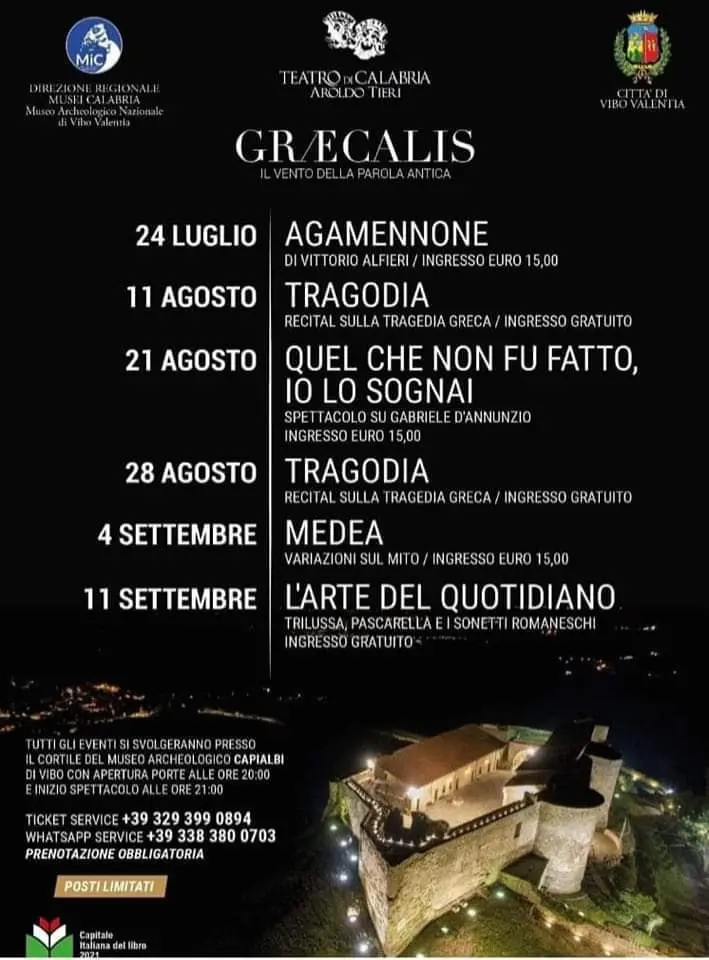 L’associazione culturale “Teatro di Calabria-Aroldo Tieri”, in collaborazione con il Museo archeologico nazionale di Vibo Valentia e con il patrocinio del Comune di Vibo Valentia, ha organizzato l’evento “Graecalis, Il vento della parola antica”, ossia sei spettacoli teatrali (uno a luglio, tre ad agosto e due a settembre) che si terranno nel cortile del Museo Archeologico Capialbi di Vibo Valentia. Il 24 luglio andrà in scena l’opera “Agamennone” di Vittorio Alfieri, l’11 agosto la “Tragodia”, un recital sulla tragedia antica, il 21 agosto “Quel che non fu fatto, io lo sognai”, su Gabriele D’Annunzio, il 28 agosto la “Tragodia”, il 4 settembre la “Medea” (variazione sul mito) e l’11 settembre “L’arte del quotidiano” su Trilussa, Pascarella e i sonetti romaneschi. Gli organizzatori dell’evento, nonché membri dell’associazione Teatro di Calabria, ringraziano la direzione del Museo, e dunque Maurizio Cannatá, e il Comune di Vibo Valentia «per l’interesse e la stima dimostrati verso il nostro lavoro» e, rivolgendosi alla città che li ospiterà, affermano: «Non vediamo l’ora di cominciare: amici di Vibo, il vento della parola antica sta per soffiare anche da voi».