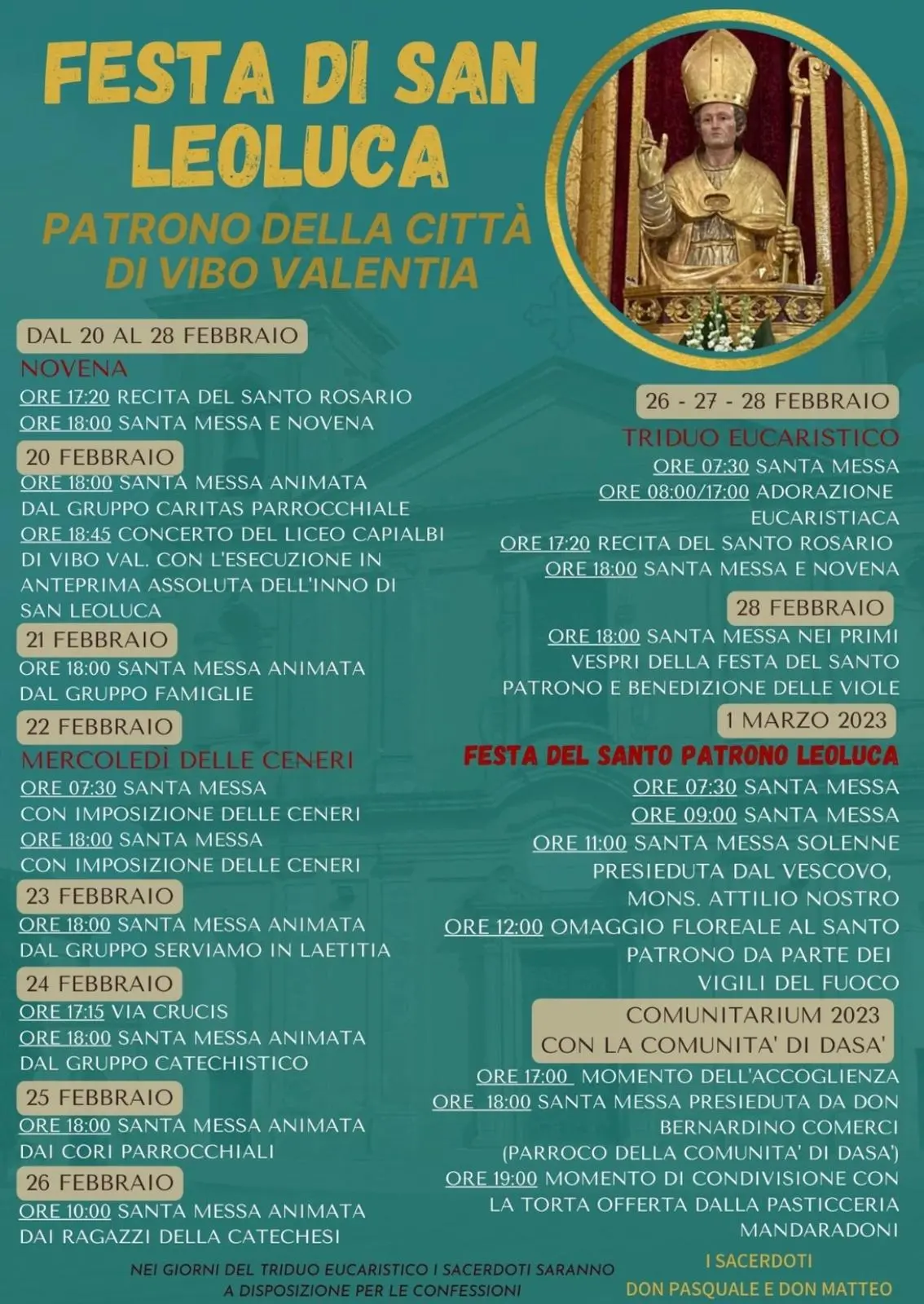 Lunedi 20 febbraio prenderà avvio ufficialmente la “Novena”, con la santa messa alle ore 18; il 26, 27 e 28 ci sarà il triduo eucaristico. Il 1° marzo alle ore 11, nel Duomo a san Leoluca dedicato, la santa messa solenne, presieduta dal vescovo mons. Attilio Nostro, alla presenza delle massime autorità civili, militari e religiose della città e della provincia, con la devota partecipazione della comunità cittadina. Al termine, seguirà il consueto omaggio floreale al simulacro del santo Patrono – posto sulla balaustra del Valentianum – da parte dei vigili del fuoco. Alle ore 17 si entrerà nel vivo del “Comunitarium”, con il ”Momento dell’Accoglienza”, che quest’anno vedrà come ospite la Comunità di Dasà, guidata dal sindaco, Raffaele Scaturchio, e dal parroco, don Bernardino Comerci, il quale, alle ore 18, presiederà la celebrazione eucaristica. A conclusione, il “Momento della Condivisione”: un simbolico incontro, improntato alla convivialità, tra le due comunità – quella vibonese e quella dasaese – addolcito dalla tradizionale torta offerta dalla pasticceria Mandaradoni.