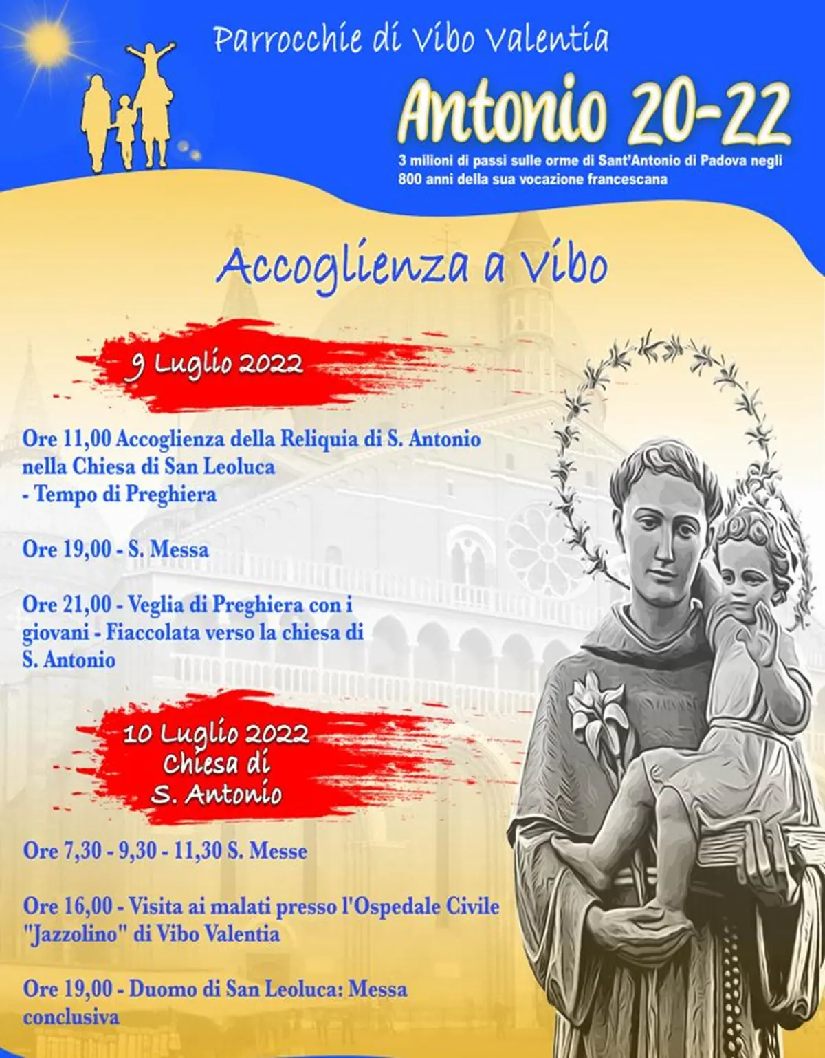 Partito da Capo Milazzo, giungerà oggi a Vibo Valentia il cammino sulle orme di Sant’Antonio. Alle 11 le reliquie del Santo saranno accolte nel Duomo di San Leoluca dove sosteranno per tutta la giornata. Un ricco programma accompagnerà la sosta in città delle reliquie del Santo Padovano. Alle 19 sarà celebrata la Santa Messa, alle 21 una veglia di preghiera che si concluderà con una fiaccolata per accompagnare le reliquie nella Chiesa del Convento dedicata al Santo. Domenica 10 luglio dopo le messe celebrate nella chiesa del Convento le reliquie saranno accolte nei reparti dell’ospedale della città. Alle 19 faranno ritorno nel Duomo della città per la celebrazione conclusiva. A camminare sarà un piccolo gruppo di pellegrini “fissi” con una reliquia ex ossibusdi sant’Antonio. A loro potrà, di tappa in tappa o per piccolo tratti, aggregarsi chiunque liberamente, senza necessità di iscrizione e in autonomia logistica, e farsi compagno di viaggio con Antonio condividendo il suo percorso di vita, scoprendone esperienze, incontrando comunità. [Continua in basso]