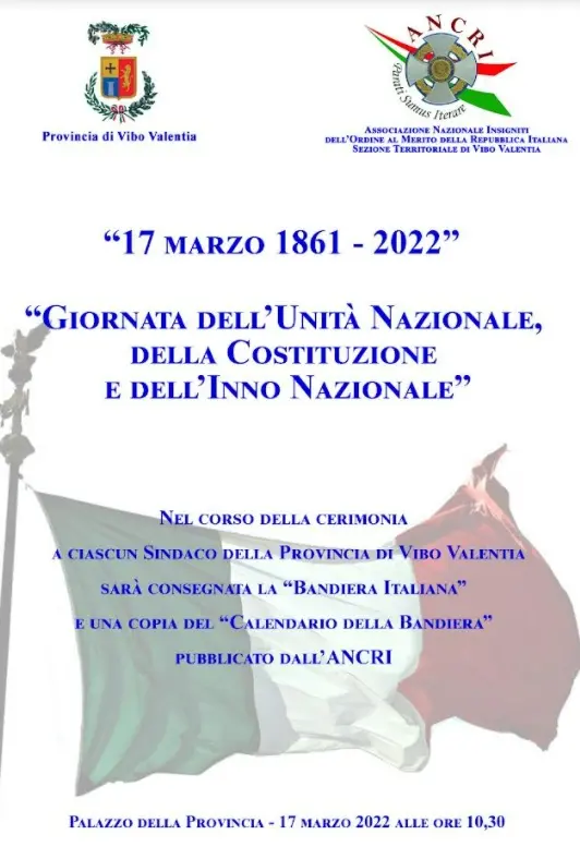 «Promuovere i principi costituzionali su cui si fonda lo Stato democratico; sostenere i valori di cittadinanza; riaffermare e consolidare l’identità nazionale e i suoi simboli». Questi gli intenti sui quali si incentra la “Giornata dell’Unità nazionale, della Costituzione, dell’Inno e della Bandiera” che, quest’anno, la sezione provinciale dell’Associazione nazionale insigniti dell’ordine al merito della Repubblica Italiana (Ancri), presieduta dal cavaliere, Gaetano Paduano, e la Provincia di Vibo Valentia, guidata dal presidente, Salvatore Solano, festeggeranno assieme ai 50 sindaci del Vibonese, alla presenza di sua eccellenza il prefetto di Vibo, Roberta Lulli, e del vescovo di Mileto-Nicotera-Tropea, monsignor Attilio Nostro. [Continua in basso]