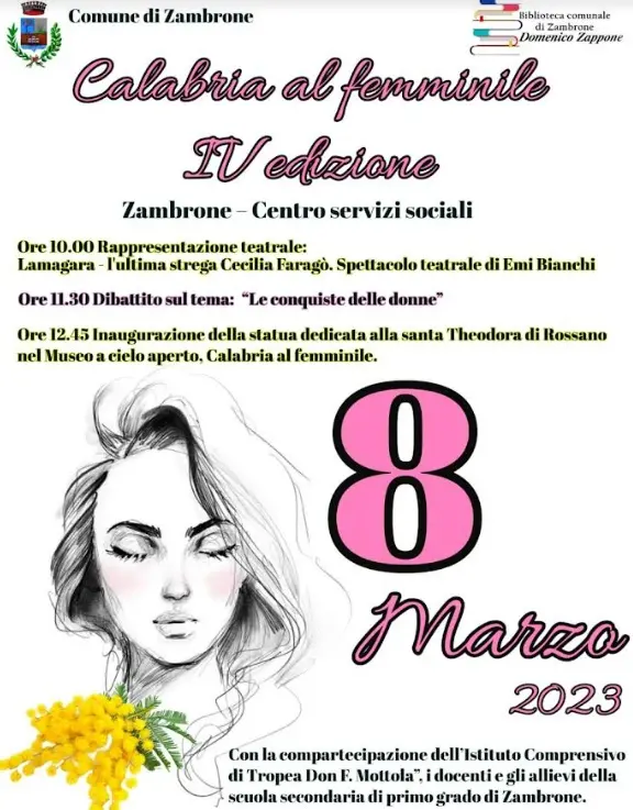 Anche quest’anno, in occasione della festa della donna, il comune di Zambrone organizza la rassegna “Calabria al femminile” che giunge così alla quarta edizione. Il programma prevede la mattina rappresentazione teatrale: “La magara, l’ultima strega Cecilia Faragò”. Uno spettacolo teatrale intenso, ideato, diretto e interpretato dall’attrice Emi Bianchi. L’opera si snoderà in un monologo di un’ora e racconterà la reale vicenda dell’ultima donna processata per stregoneria. A seguire, un dibattito che vedrà protagonisti gli allievi della scuola secondaria di primo grado di Zambrone, unitamente ai docenti e al dirigente scolastico Francesco Fiumara e quanti saranno presenti all’evento (la partecipazione è aperta a tutti). [Continua in basso]