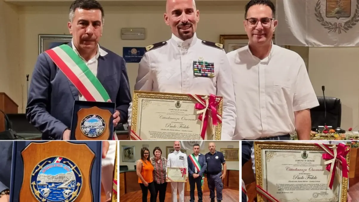 Una serata ricchissima di emozioni. Il Comune di Zungri ha conferito a Paolo Fedele, ufficiale vibonese in servizio presso la Capitaneria di porto di Napoli, la cittadinanza onoraria. Il riconoscimento è stato tributato si legge nelle motivazioni: «per il lodevole impegno umano e professionale nello svolgere la sua attività di uomo di mare, come esempio di vita ispirata ai valori della solidarietà umana nei confronti delle persone più deboli ed emarginate, per l’esemplare affezione verso la città di Zungri e la sua comunità testimoniata da iniziative finalizzate a promuovere la conoscenza e la valorizzazione della città in tutti gli aspetti, socio-economici, artistici, storico-cultuali, umani e religiosi». [Continua in basso]