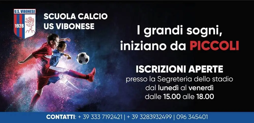 Per informazioni ed iscrizioni a tutte le categoria della Scuola calcio rivolgersi alla Segreteria generale della Vibonese presso lo stadio “Luigi Razza” in via P.zza D’Armi a Vibo Valentia o ai numeri di telefono 0963 45401 e/o 3283932499 dal lunedì al venerdì dalle 9:30 alle 13:00 e dalle 15:30 alle 18:00.