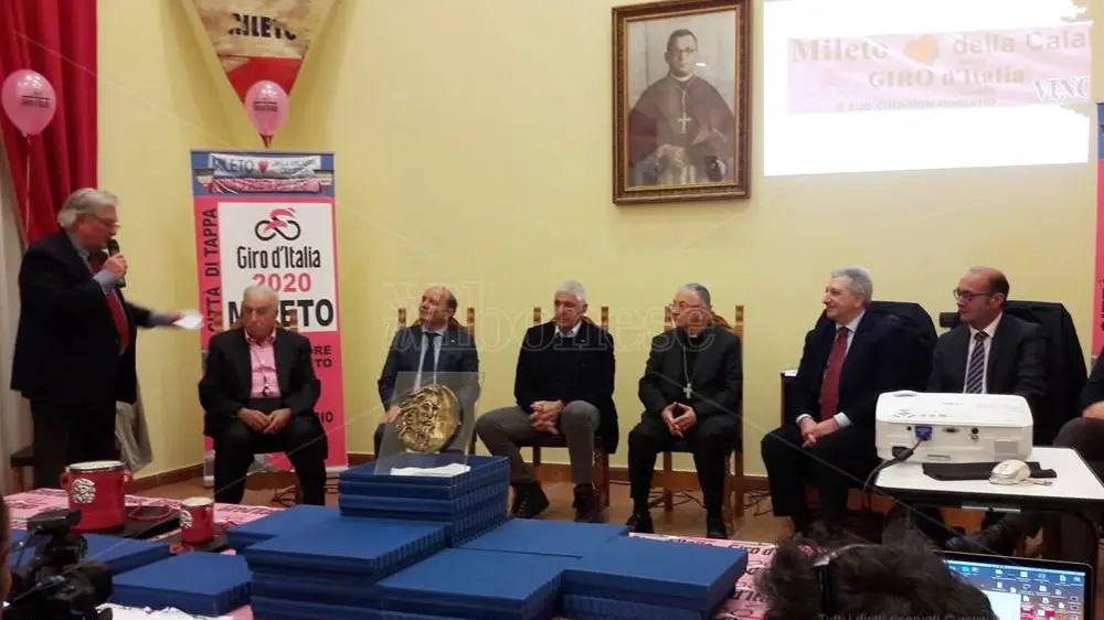 La “festa rosa” nella cittadina normanna è iniziata. Il percorso di avvicinamento alla settima tappa del Giro d’Italia 2020 con partenza da Mileto e arrivo a Camigliatello Silano, prevista per il prossimo 15 maggio, ha preso il via ieri sera con una conferenza stampa di presentazione allestita nell’auditorium “Monsignor Vincenzo De Chiara”, situato all’interno del seminario vescovile. In una sala gremita in ogni ordine di posto, a presenziare al tavolo sono stati, tra gli altri, il vescovo della diocesi di Mileto-Nicotera-Tropea monsignor Luigi Renzo – qui nella veste di presidente dell’apposito comitato organizzatore – l’ex guida della Federazione ciclistica regionale e presidente dello Sporting Club Mimmo Bulzomì, il pluricampione del mondo Francesco Moser, il sindaco di Mileto Salvatore Fortunato Giordano e il presidente dell’associazione Maranathà don Domenico Dicarlo, il viceprefetto Sergio Raimondo, Giuseppe Abate dirigente della Regione Calabria e Salvatore Monaco sindaco di Spezzano Sila, comune entro il quale ricade Camigliatello. A moderare la serata, il noto telecronista Rai Giorgio Martino, Nell’occasione, il commentatore di memorabili imprese del ciclismo ha messo in evidenza come la partenza di una tappa dell’edizione 2020 della Corsa rosa rappresenti un’occasione unica per la città di Mileto, «la quale avrà la possibilità di mostrare il meglio di sé e il suo illustre trascorso normanno su scala mondiale». Martino ha poi ricordato «il padre di questa vera e propria impresa» e l’amicizia di lunga data che lo lega al patron di mille corse Mimmo Bulzomì, risalente ai tempi in cui nella cittadina normanna organizzava la “Corsa del Sole” dedicata al modo dilettantistico, «fucina di campioni che poi hanno fatto la storia del ciclismo internazionale ed entrati nel mito come Marco Pantani». [Prosegue sotto la pubblicità]