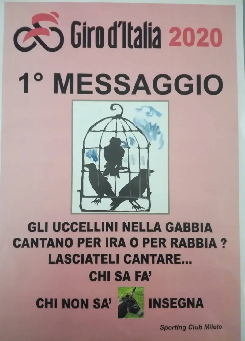 Il battagliero patron ed ex presidente regionale della Federazione ciclistica italiana ieri era a Palermo, a collaborare con Rcs Sport e ad assistere alla cronometro che ha permesso al neo campione del mondo a cronometro su strada Filippo Ganna di indossare la prima maglia rosa. Qualche ora prima di trasferirsi in Sicilia, però, si era voluto togliere qualche sassolino dalla scarpa, facendo affiggere dei manifesti “pepati” nei confronti di alcuni criticatori seriali miletesi. Un atto chiaramente ironico, che contribuisce a rendere ancora più piccante e appetitosa l’attesa per lo storico appuntamento sportivo di mercoledì prossimo.