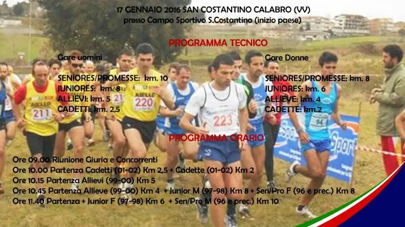 L’appuntamento è per il prossimo 17 gennaio, quando, dalle 9 in poi, dal campo sportivo di San Costantino prenderanno il via le competizioni, su diverse distanze, valide per i titoli individuali Assoluto (S/P), Promesse, Junior, Allievi, Maschile e Femminile, in una manifestazione che, come detto, sarà valida anche ome prima prova del Campionato di società assoluto di Cross e fase regionale del campionato di società di corsa campestre cadetti/e.