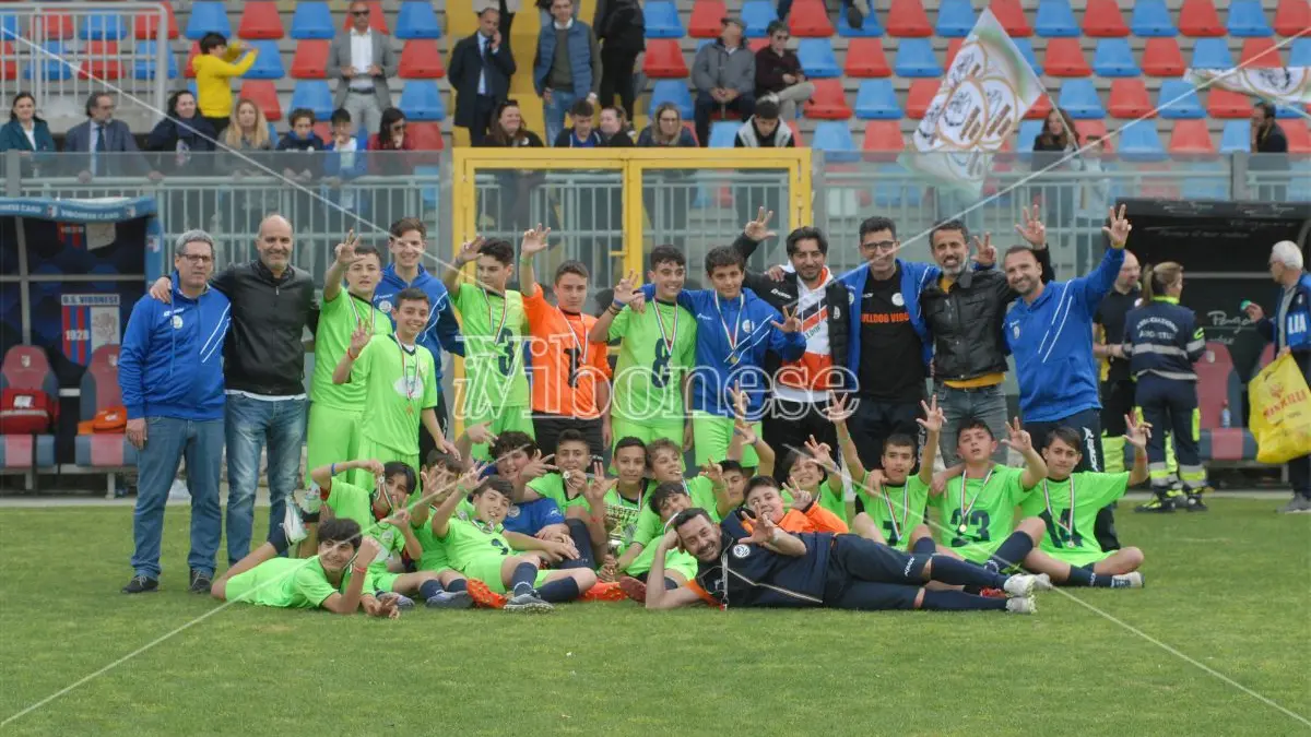 Sa solo vincere la Bulldog. E sa anche regalarsi dei bei momenti di aggregazione collettiva. Gli abbracci e gli applausi questa volta sono quelli degli Esordienti, campioni provinciali, categoria Under 13, dopo aver battuto la Vibonese in una finale giocata con tanto fair play in campo e fra le panchine. Sorrisi e tanta gioia per la formazione allenata da Leo Callipo, il quale nel giorno del suo compleanno si regala questo titolo provinciale che arriva dopo un percorso di crescita nel quale lavoro e passione, sacrificio e competenza hanno rappresentato la parte integrante di un gran bel viaggio. Si è invece arresa la Vibonese, uscita dal campo a testa alta, anzi altissima. Ma si cresce con le vittorie ed anche con le sconfitte. È sempre bello esserci, comunque, in queste finali, per vivere certi momenti, che diventano ancora più belli se si può giocare, com’è successo stavolta, allo stadio Luigi Razza. [Continua in basso]