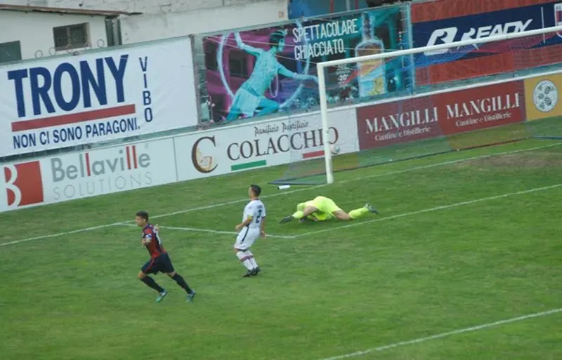Primo giro di lancette e Casertana subito pericolosa. I campani sfondano sulla destra e poi D’Angelo, a tu per tu con Greco, si fa chiudere lo specchio della porta dall’estremo di casa. Due minuti dopo, un cross di Tito mette in crisi la difesa ospite che si rifugia in angolo non senza affanno. La formazione di Ginestra è però molto intraprendente e all’8′ un cross dalla sinistra taglia tutto lo specchio della porta per terminare in corner, sulla successiva battuta di Zito, Greco è costretto ad una perentoria uscita di pugno per spazzare la propria area. Al 16′ Tito prova dal limite e Allegretti per un soffio non trova il tocco vincente ad un metro dalla linea di porta, per l’arbitro però era in offside. Scocca il 23′ e la Vibonese passa in vantaggio: grande percussione sulla destra di Berardi che taglia sulla sponda opposta per Bubas che entra in area e scarica di sinistro sotto l’incrocio dei pali, una bellissima marcatura. Due giri di lancette e i rossoblu di casa sfiorano il raddoppio con Berardi, fermato, dopo uno scambio con Allegretti, in disperata uscita dal portiere. La Casertana prova a reagire, ma al 30′ il colpo di testa di D’Angelo, da ottima posizione, è in sostanza un appoggio a Greco. Al 35′ ci prova invece Allegretti dal limite, che tira forte ma fuori misura. Il secondo gol arriva al minuto 38: Tumbarello gestisce bene la sfera e innesca Berardi che recupera due metri a Caldore, entra in area e viene atterrato, è rigore; dal dischetto Allegretti spiazza il portiere. Il penalty costa alla Casertana oltre che la seconda rete subita, anche l’espulsione di Caldore per fallo da ultimo uomo. La partita sembra chiusa ma così non è ed in pieno recupero uno svarione di Malberti in gioco aereo, favorisce la gran giocata di Castaldo che offre a Starita il pallone del 2-1.
