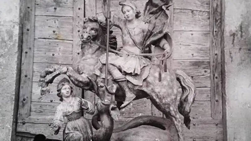 La storia che stiamo per rivelare, raccontata con perizia di particolari da David Donato su “Calabria Letteraria”, aprile-giugno 1987, ebbe inizio il 6 luglio 1913 allorquando alla stazione ferroviaria di Pizzo si fermò il treno che depose a terra la statua di San Giorgio in sella al suo cavallo rampante. Tale vicenda, ad ogni modo, fa parte della memoria storica di un’intera collettività, quella pizzitana, della quale ancora oggi se ne conserva traccia. La statua del santo cavaliere originario dell’Asia Minore, patrono della città, era stata acquistata per essere collocata nella chiesa matrice a lui dedicata e che vanta di essere la più antica collegiata della diocesi di Mileto. L’opera era stata commissionata allo scultore tirolese Josef Runggaldier per sostituire il “Sa’ Giorgèju”, così soprannominato dai pizzitani perché trattasi di un mezzobusto di dimensioni modeste risalente al XVIII secolo e laminato in oro ed argento, tutt’ora presente nella chiesa e che si narra sia stato donato dai pescatori amalfitani di corallo, che in queste acque sovrabbondava di qualità eccelsa. La scultura lignea del cavaliere cappadoce era a grandezza naturale e non appena venne esposta al pubblico la cittadina si divise tra quanti furono entusiasti del lavoro dell’artista altoatesino e quelli, la stragrande maggioranza, che si dissero scandalizzati, tanto da fare insorgere una sorta di sommossa popolare. Il motivo di tanta avversità nei confronti dell’opera fu che l’animale, che si alzava sulle zampe posteriori, mostrava in bell’evidenza i suoi attributi riproduttivi, ritenuti di proporzioni eccessive così da offendere la vista dei fedeli in preghiera.